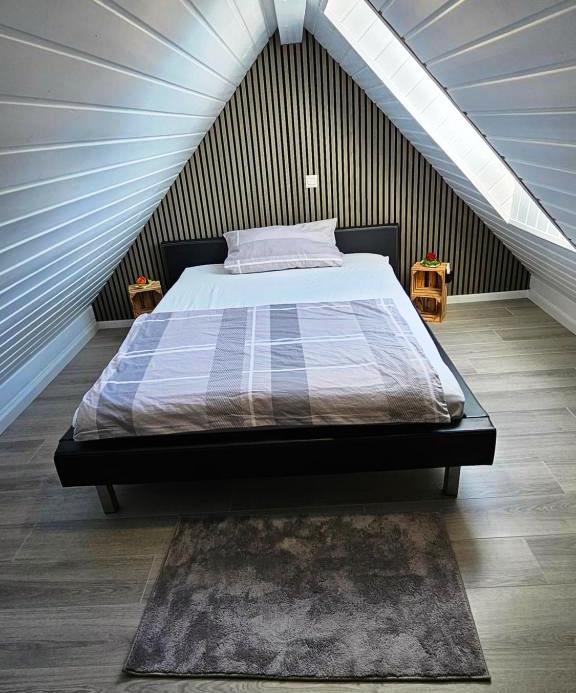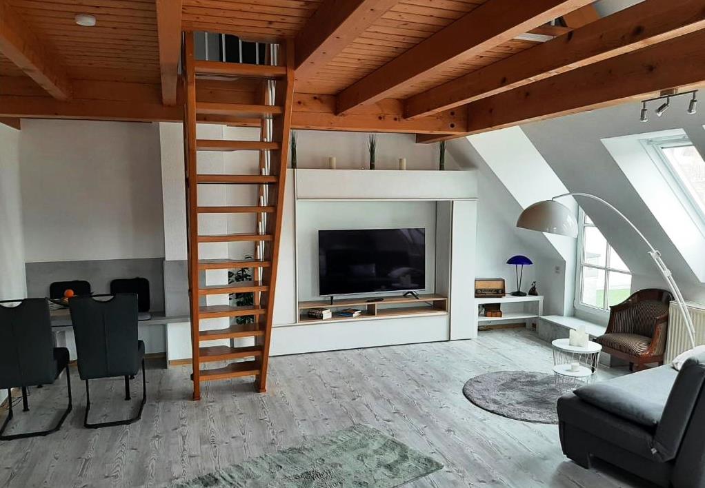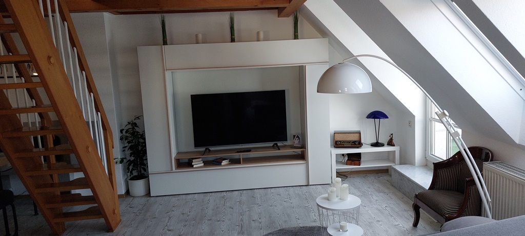 Im gleichen Raum befindet sich das bequeme Bett 1,80 x 2,00 m, daran schließt direkt der gemütliche Wohnbereich mit Ausziehcouch an, die auf 1,40 x 2,00 m erweitert werden kann. Es gibt einen 55 Zoll Smart TV (geeignet für Streamingdienste) und kostenloses WLAN.