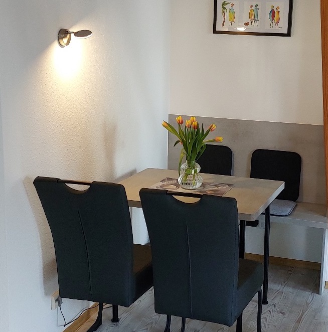 Die Essecke für bis zu 4 Personen. Bank, Tisch und 2 sehr bequeme Stühle.