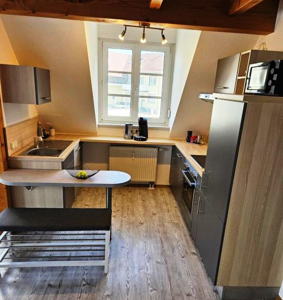 Komplett ausgestattet mit kleiner Theke und Sitzbank, Herd, Backofen, Mikrowelle, Pad-Kaffeemaschine, Wasserkocher, Kühl-Gefrierkombination, 6-teiliges Geschirr- und Besteckset, Gläser, Töpfe, etc.