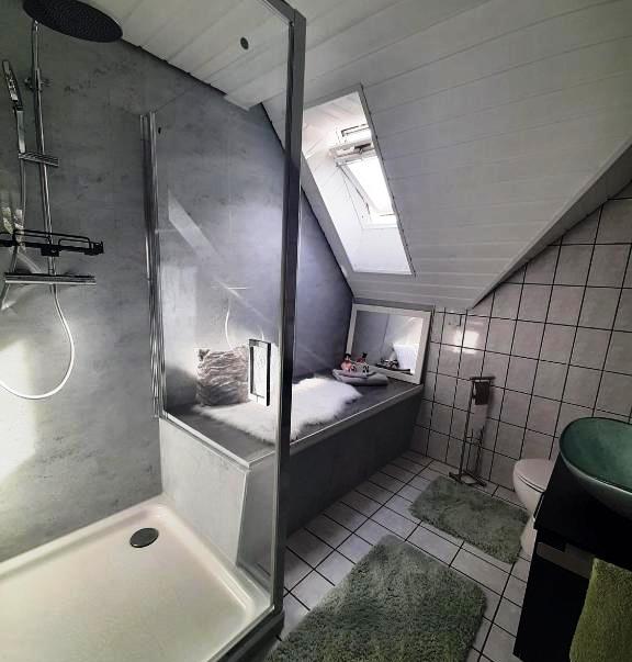 Neu gestaltetes Badezimmer, große Dusche, Waschbecken, Toilette, Handtücher, große Ablagefläche.