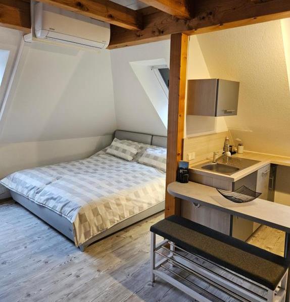 Das Studio ist über eine Raumspartreppe (55 cm breit) zu erreichen. 1 Bett 1,40 x 2,00 m. Mittige Höhe 1,80 m. Urgemütlich und hell.